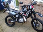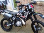 just thought i would put a few pics up of my pride and joy,year 2000 with athena 170cc big bore kit,18/55 gearing,gold chain,renthal bars,pirelli scorpion rear tyre,dunlop trailmax front,powdercoated frame,swing arm and fork lowers,the wheels are hand painted in matt black as they were in need of a refurb so i had nothing to lose,and i must say the outcome was alot better than i expected but we will see how long it lasts...,2010 yzf front fender,hpires rear,tail tidy,carbon fibre vinyl number boards,polisport front headlight,full dep with polished end can,next on the list is full stainless bolt kit,no bad for a 42 year old grandad reliving his youth lol..