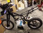 Since the last update i have the carb, airbox, battery tray, shock & linkage, chain, brake lines fitted so went to put the tank on and realised my tap was broken. So got a tap which i had spare and that leaked too. So ordered an aftermarket tap which was designed for a smaller fuel pipe then had to wait another week to so for a genuine one. Then fitted the exhaust and hooked the battery up, managed to kick it over and it idled for a bit but would not rev. So i currently have the carb off as i think the floats jamming and thats what im upto at the moment.